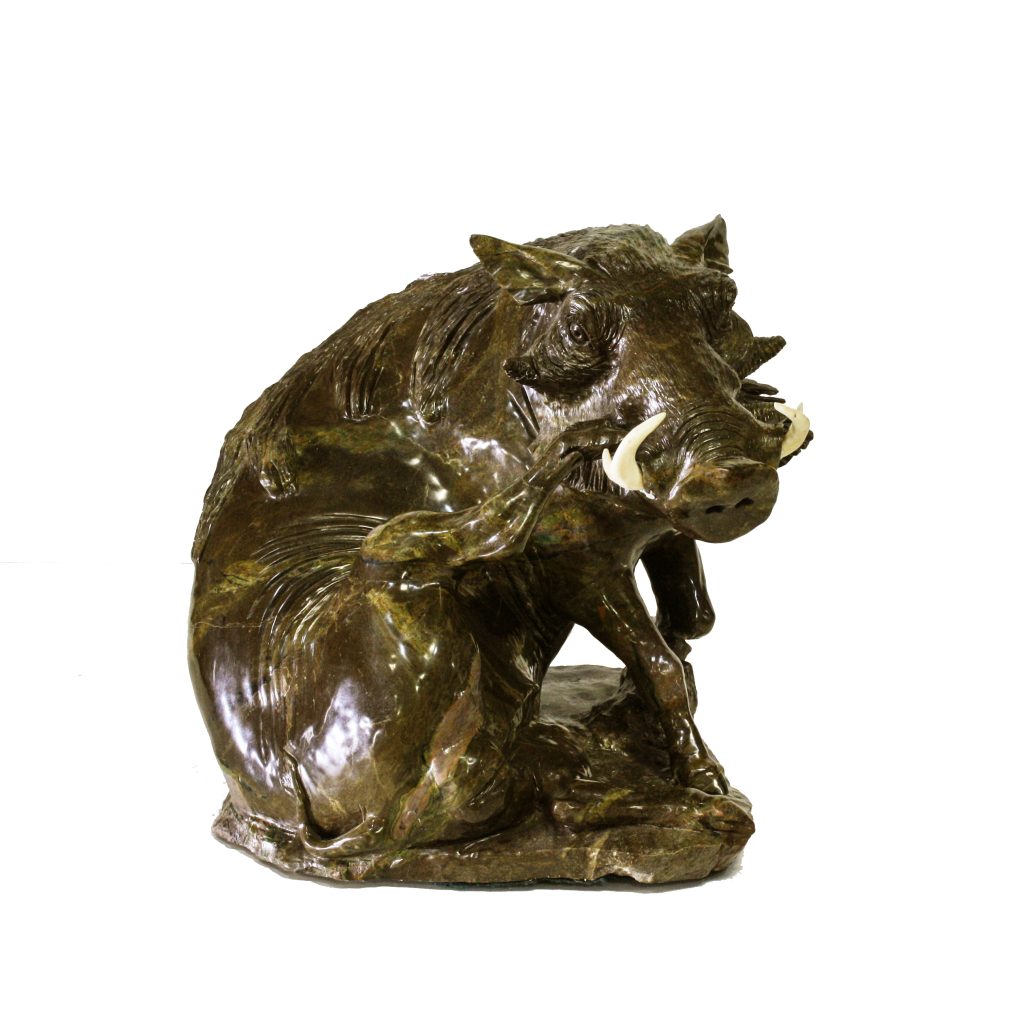 This wonderfully realistic, dynamic, rare, dark green verdite warthog is an original sculpture titled “An Art to Scratching” by acclaimed Zimbabwean sculptor James Tandi (1956-2020). Dimensions are 16x16x16. Verdite is no longer available in Zimbabwe, as the only verdite mine has closed, making this an incredibly rare piece that would be memorable in your home!