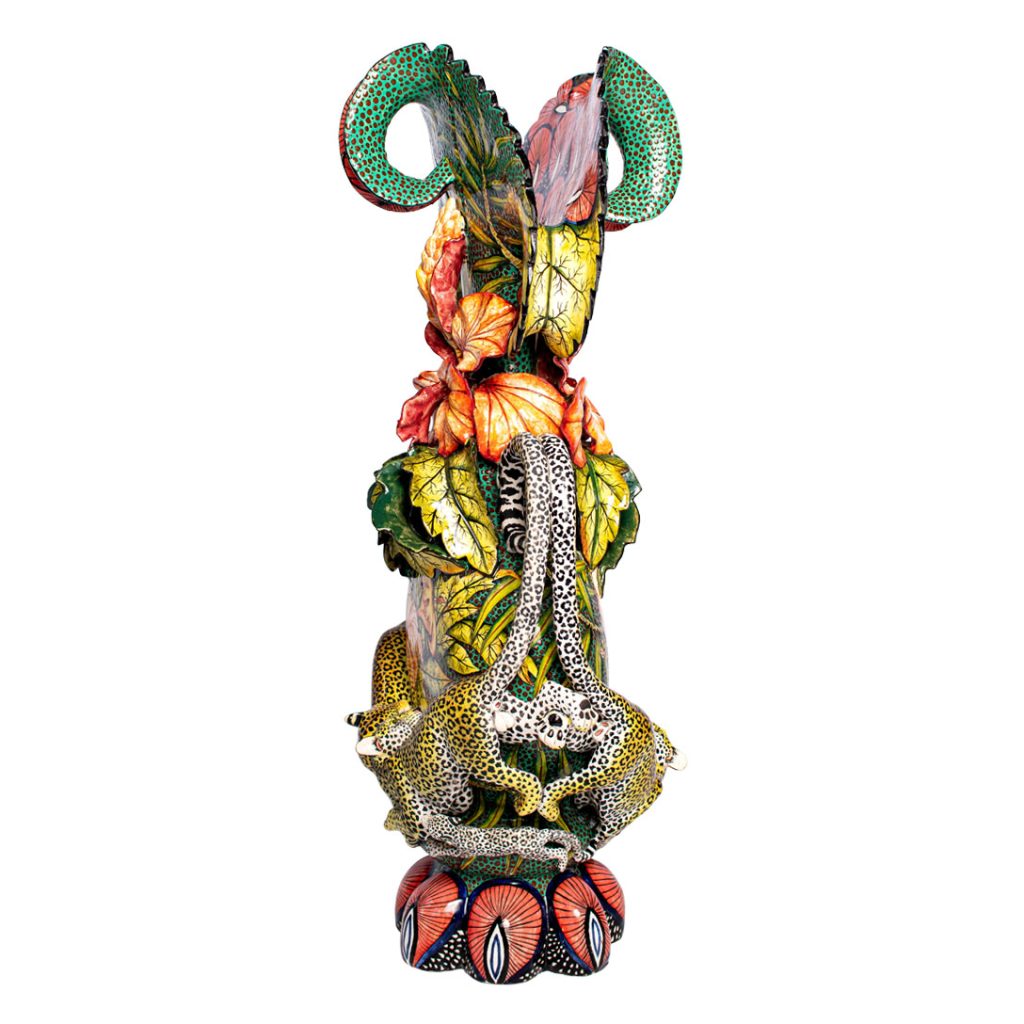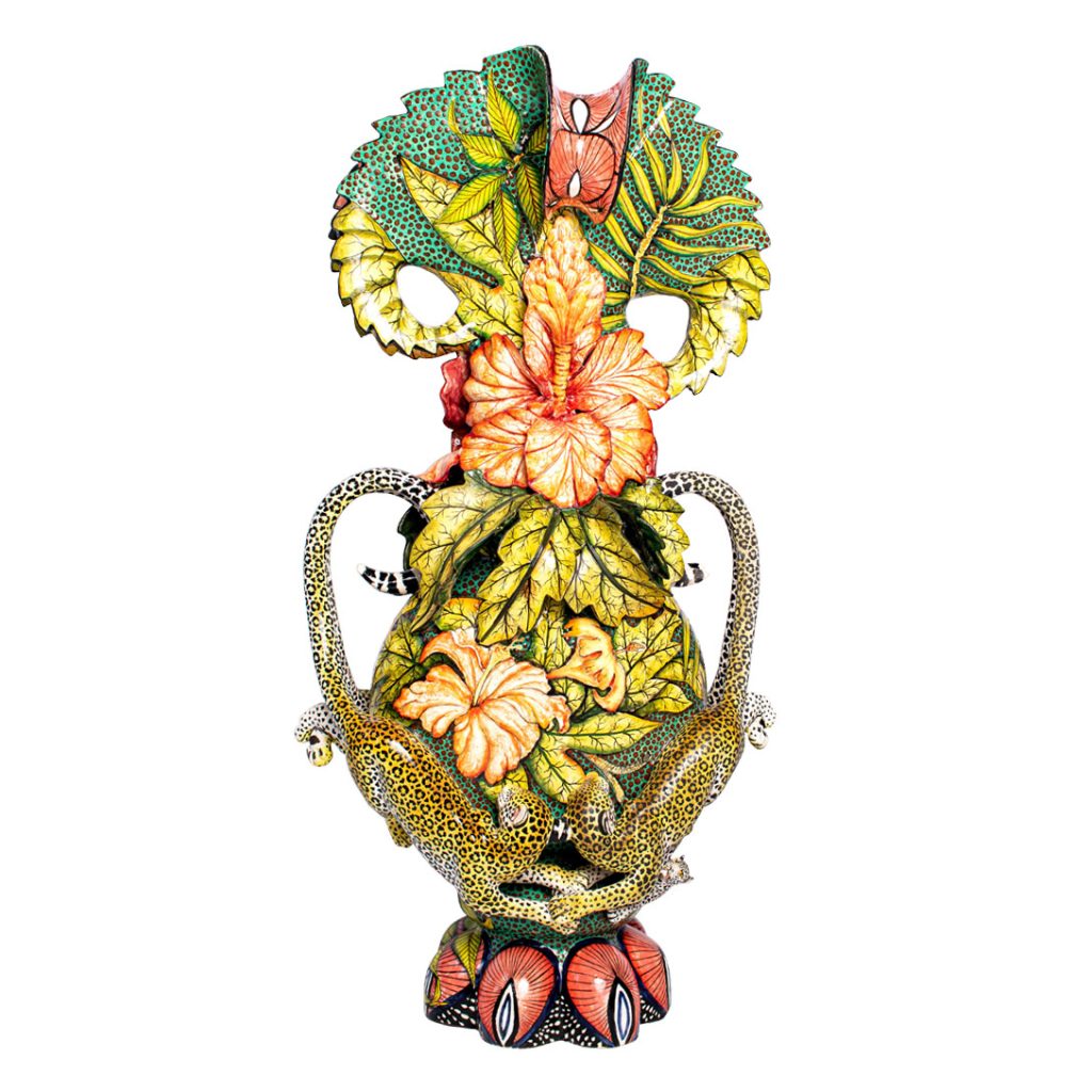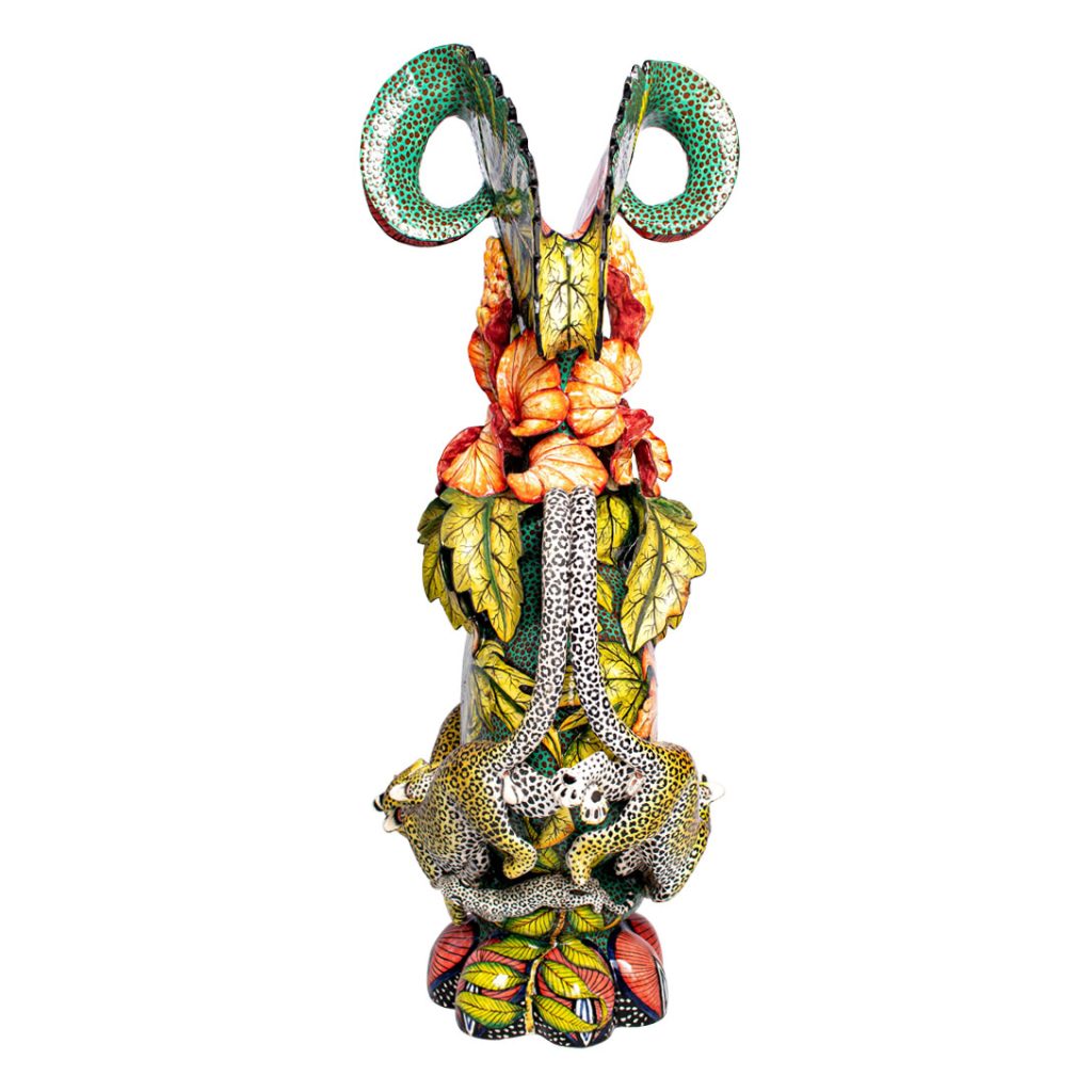 This is a magnificent ceramic urn replete with three-dimensionally sculpted leopard figures, hibiscus flowers, and a variety of native vegetation. A spectacular focal point for any home, this piece measures 29″ high x 15″ long x 10″ wide. Designed and sculpted by Thabiso Mohlakoana and painted by Mlu for Senzo Duma Ceramics.
